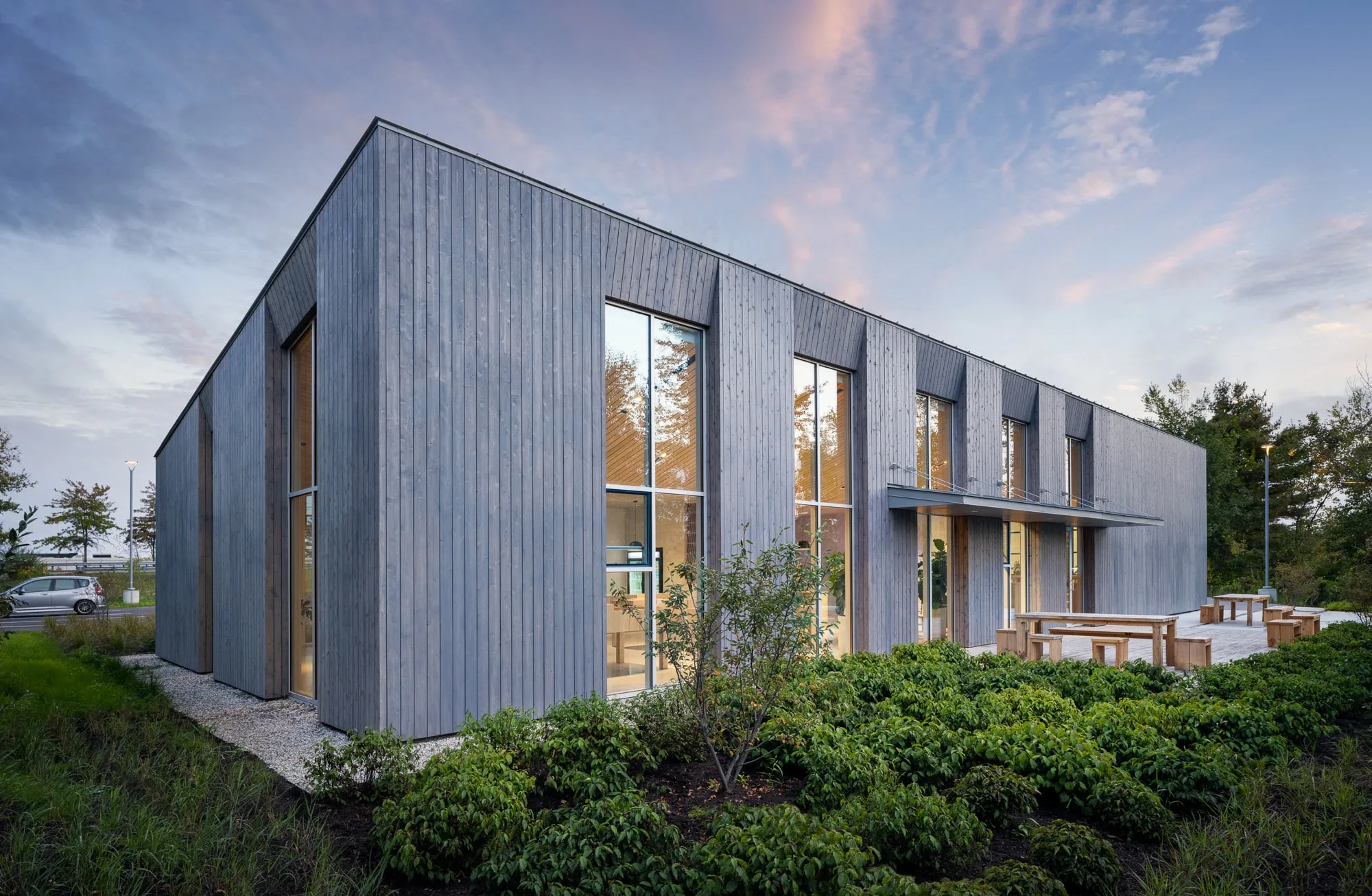 The front of the building is austere in appearance from the roadside. In contrast, the rear faces wetlands and opens up with floor-to-ceiling windows that capture spectacular views and plenty of light. A large deck allows for outdoor space as part of Seaweed’s commitment to promoting marijuana wellness education. The site was carefully designed to respect the landscape, including selecting natural plants and permeable pavers with a filtration system to clean rainwater before it returns to the wetlands.