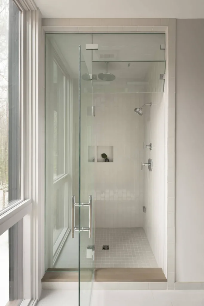 A connection to the landscape guided the design of this Maine home, and no matter where you are inside, the outdoors are always within view. Simple rectangular forms with distinct angles and floor-to-ceiling windows create a striking structure against a wooded backdrop. Cool and neutral tones throughout the living areas keep the home open and light.