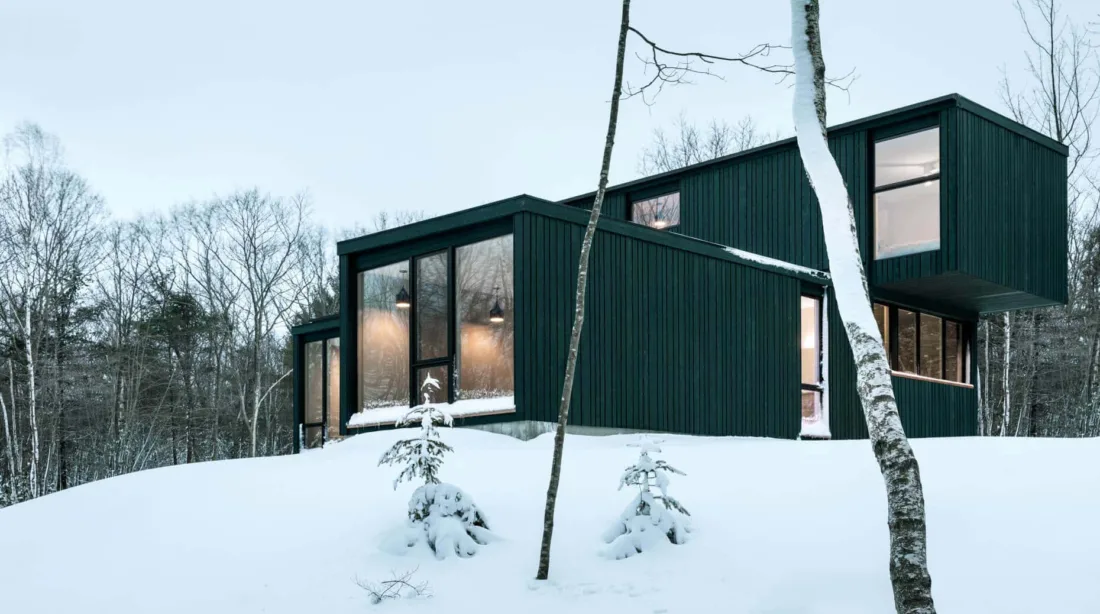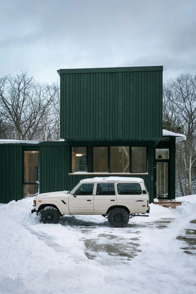 Outside, stained green eastern white cedar is set at random widths and windows are recessed in double stud wall construction. This technique gives the exterior a feeling of depth and mimics the variety of light and shadows from the surrounding woods. Flat roofs varying in height paired with expansive windows enhance the sense of scale throughout the home. Any ornamental elements were stripped back for simplicity, allowing the landscape to steal the show.